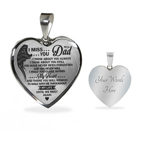 Necklace says: "I miss you Dad. I think about you always. I think about you still. You have never been forgotten and you never will. I hold you close within my heart...and there you will remain to walk with me throughout my life...until we met again."