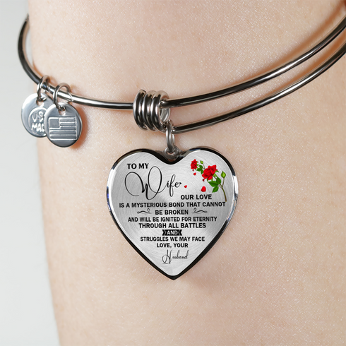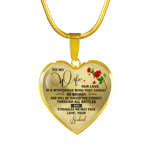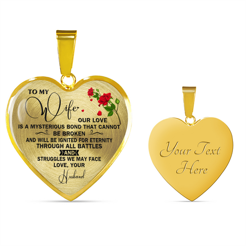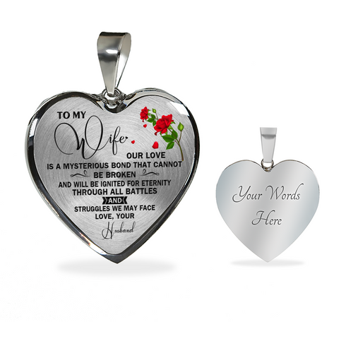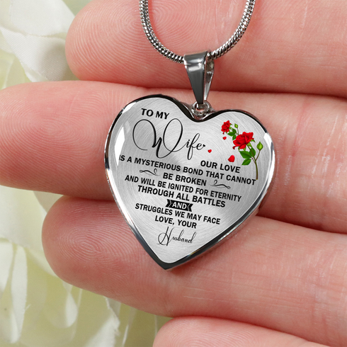 Necklace says: "To my wife, Our love is a mysterious bond that cannot be broken, and will be ignited for eternity, through all battles and struggles we may face. Love, your husband."