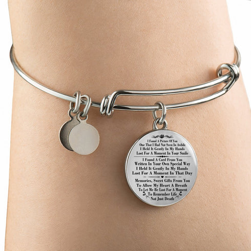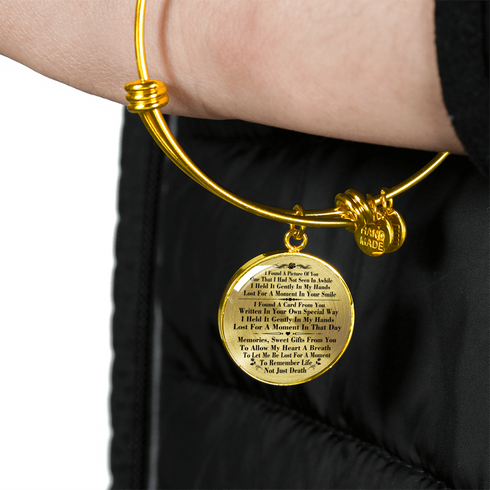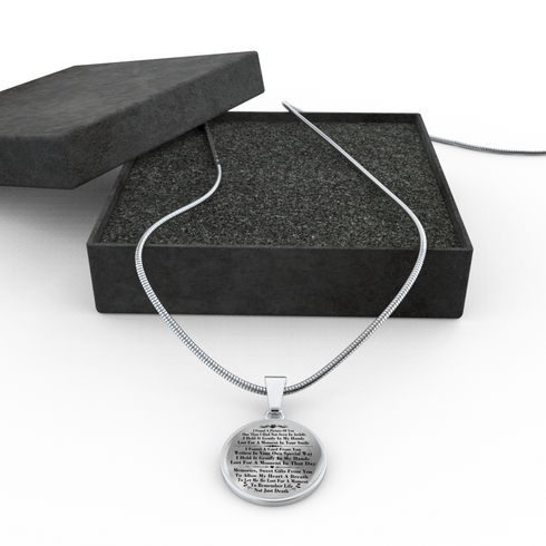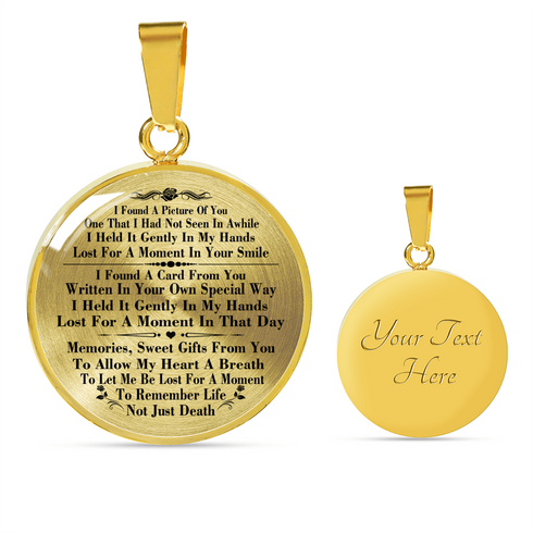 Necklace says: "I Found A Picture Of You One... that I had not seen in awhile, I held it gently in my hands... Lost for a moment in your smile... I found a card from you ...Written in your own special way... I held it gently in my hands... Lost for a moment in that day... Memories, sweet gifts from you, To allow my heart a breath... To let me be lost for a moment... To remember life not just death"