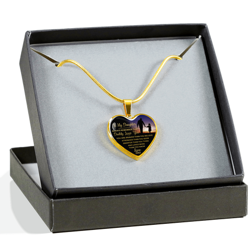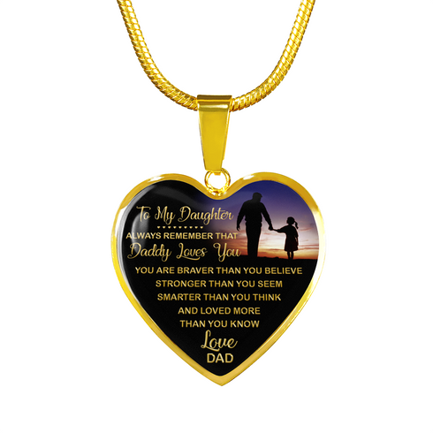 Necklace says: To My Daughter, Always Remember That Daddy Loves You, You Are Braver Than You Believe, Stronger Than You Seem, Smarter Than You Think, And Loved More Than You Know.