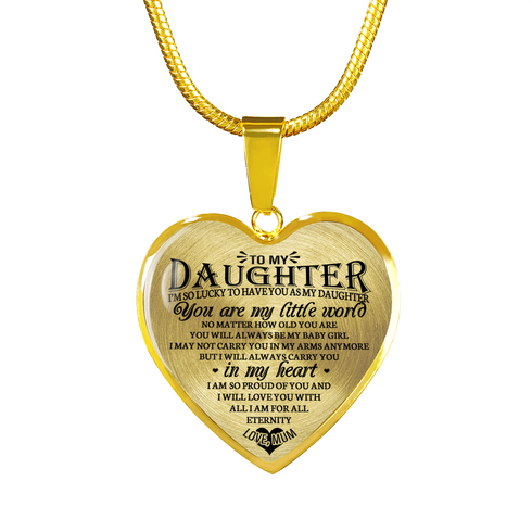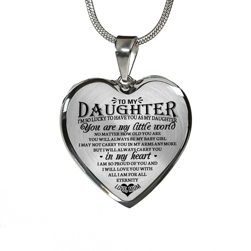 Necklace says: "To my daughter, I'm so lucky to have you as my daughter. You're my little world. No matter how old you are. You will always be my baby girl. I may not carry you in my arms anymore but I will always carry you in my heart. I am so proud of you and I will love you with all I am for all eternity. Love, mum."