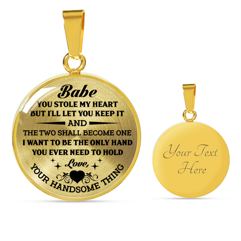 Necklace says: "Babe