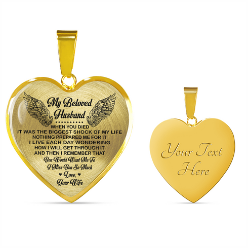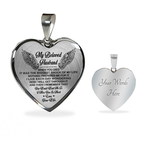 Necklace says: "My beloved husband. When you died, It was the biggest shock of my life. Nothing prepared me for it. I live each day wondering how I will get through it and then I remember that you would want me to I miss you so much. Love, your wife."