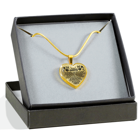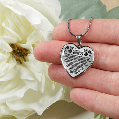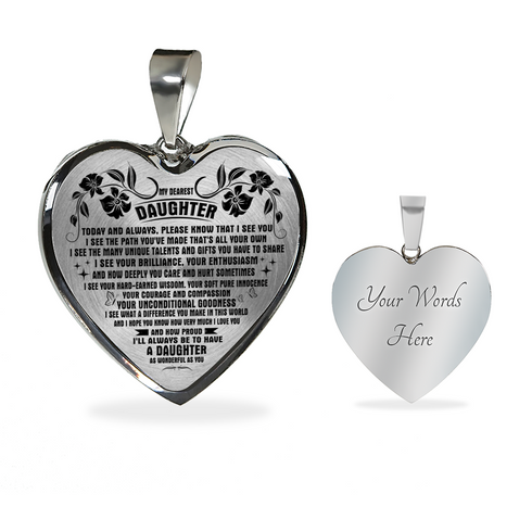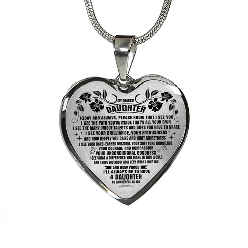 Necklace says: "My dearest daughter, Today and always, please know that I see you. I see the path you've made that's all your own. I see the many unique talents and gifts you have to share. I see your brilliance, your enthusiasm, and how deeply you care and hurt sometimes. I see your hard-earned wisdom. Your soft pure innocence, your courage and compassion, your unconditional goodness. I see what a difference you make in this world, and I hope you know how very much I love you. And how proud I'll always be to have a daughter as wonderful as you."