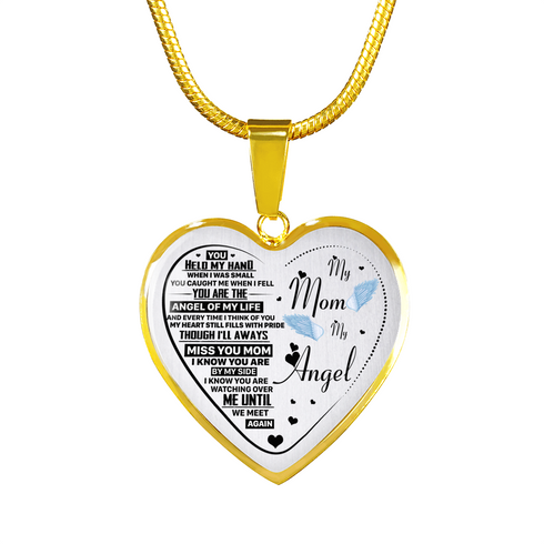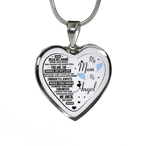 Necklace says: "My mom, my angel. You held my hand when I was small. You caught me when I fell. You are the angel of my life and every time I think of you, my heart just fills with pride and though I’ll always miss you mom, I know you’re by my side. I know you’re watching over me, until we meet again."