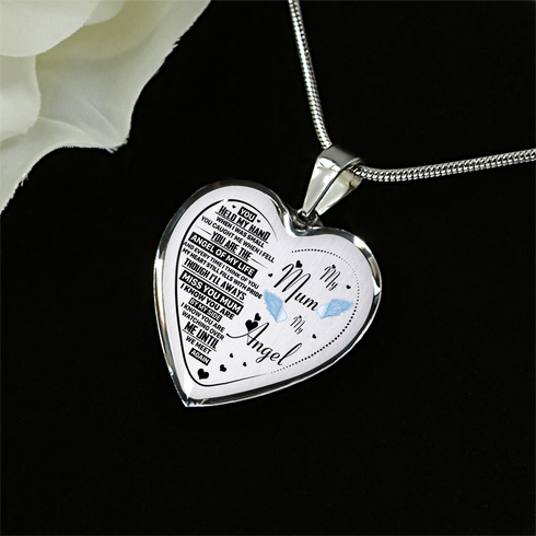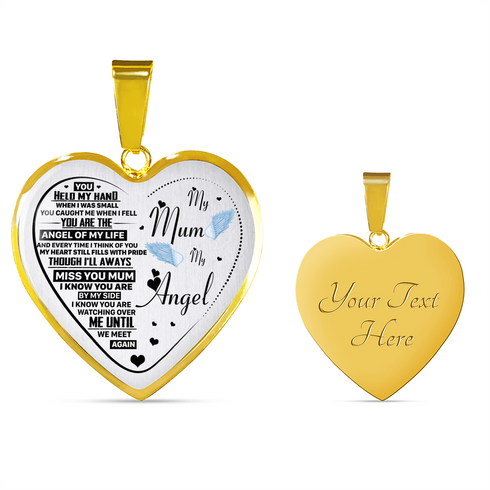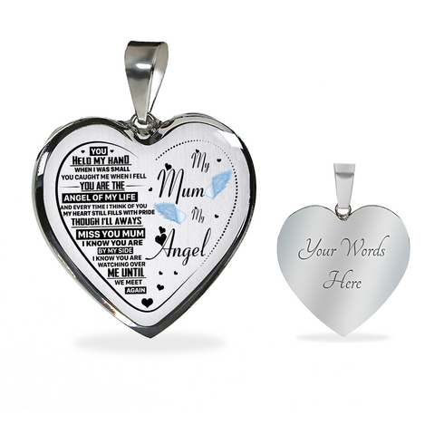 Necklace says: "My mum, my angel. You held my hand when I was small. You caught me when I fell. You are the angel of my life and every time I think of you, my heart just fills with pride and though I’ll always miss you mum, I know you’re by my side. I know you’re watching over me, until we meet again."