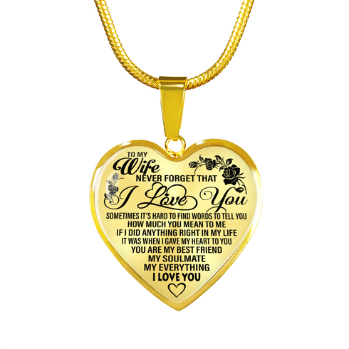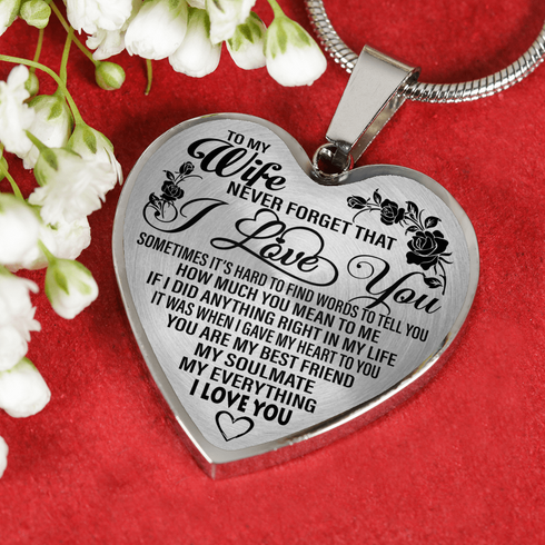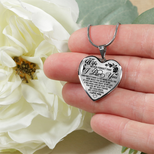 Necklace says: "To my wife. Never forget that I love you. Sometimes it's hard to find words to tell you how much you mean to me, If I did anything right in my life, It was when I gave my heart to you. You are my best friend, my soulmate, my everything. I love you."
