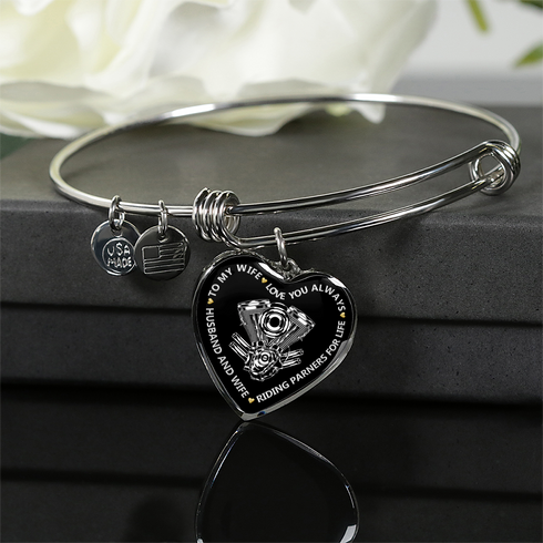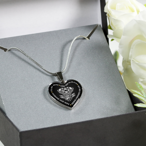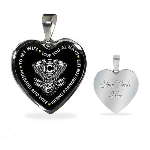 Necklace says: "To my wife. Love you always. Husband and wife. Riding partners for life."