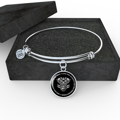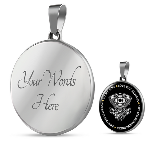Necklace says: "To my wife. Love you always. Husband and wife. Riding partners for life."