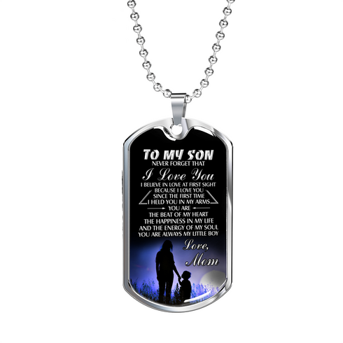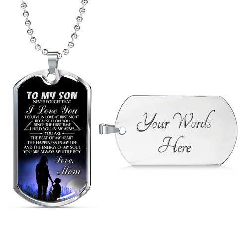 Necklace says: "To My Son... Never forget that I love you... I believe in love at first sight because I love you since the first time I held you in my arms. You are the beat of my heart. The happiness in my life...and the energy of my soul. You are always my little boy. Love, Mom."