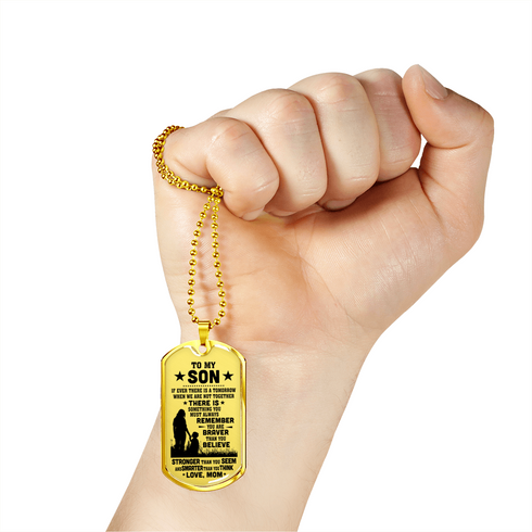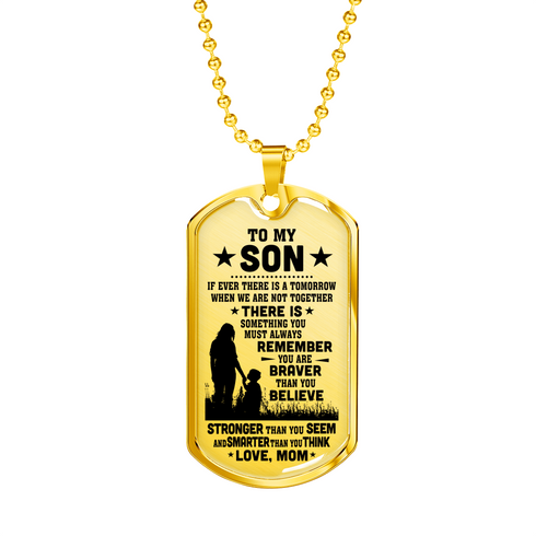 Necklace says: "To My Son, If Ever There Is A Tomorrow When We Are Not Together, There Is Something You Must Always Remember, You Are Braver Than You Believe, Stronger Than You Seem, Smarter Than You Think, And Loved More Than You Know."