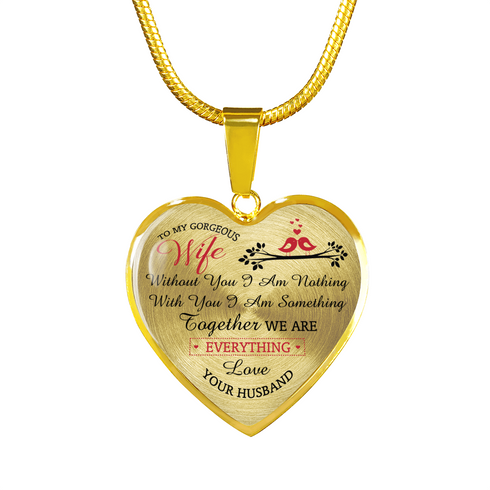 Necklace says: "To my gorgeous wife. Without you I am nothing. With you I am something. Together we are everything. Love, your husband."